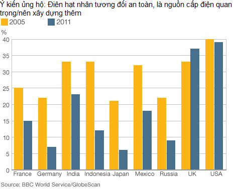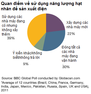 Trung tâm nghiên cứu toàn cầu GlobeScan do đài BBC ủy nhiệm, đã khảo sát 23.231 người ở 23 quốc gia từ tháng 7 đến tháng 9 năm nay, vài tháng sau thảm họa động đất và sóng thần đã phá hủy nhà máy điện hạt nhân Fukushima Daiichi của Nhật.
