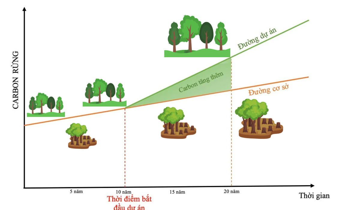 carbon của rừng gia tăng so với đường cơ sở được thiết lập bởi kịch bản phát triển thông thường (BAU) khi không có dự án. Trữ lượng