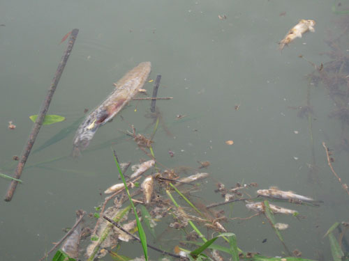 Ít phút sau, hàng chục loại cá lớn, nhỏ thoi thóp, ngoi lên mặt nước với mật độ dày đặc. Ngay sau khi biết tin, hàng trăm người dân đổ xô xuống sông bắt cá đi bán.