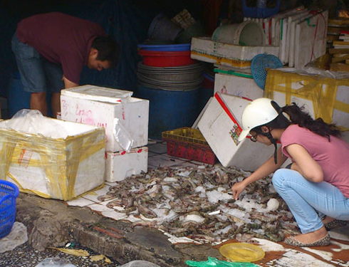 | Tôm "say" - loại tôm mới chết trong ngày - được đổ ra đất để khách hàng lựa chọn. Ảnh: Phunuonline. |