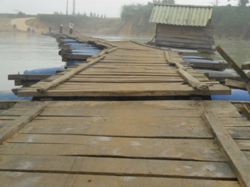 Chiếc cầu phao đơn điệu, lỏng lẻo luôn là nỗi đe doạ tính mạng của người dân khi đi qua đây. Biết nguy hiểm luôn rình rập nhưng không còn cách nào khác nên từng ngày, từng giờ người dân vẫn phải lưu thông, phó mặc tính mạng của mình cho sự may rủi.
