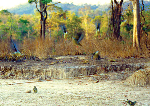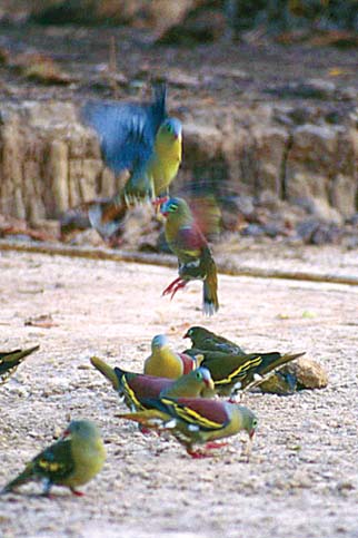 | Cu xanh không ăn lẻ một mình. Thông thường một vài con đến trước đậu trên ngọn cây cao quan sát, khi thấy bãi ăn an toàn thì cất tiếng hú gọi bầy, sau đó từng đàn lớn cu xanh tụ hội và cùng sà xuống.
