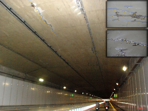 (08:19:49 AM 07/08/2012)Sáng 6-8, ghi nhận của chúng tôi tại đường hầm sông Sài Gòn cho thấy nóc hầm có dấu vết sửa chữa. Các vết trám trét trên nóc hầm chạy loằng ngoằng theo chiều dọc hoặc chiều ngang, có vết dài gần 2 m, có vết ngắn chỉ vài chục centimet.