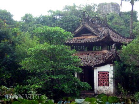 | Chùa Tám Mái giữa hồ sen bên lối vào cửa chính |