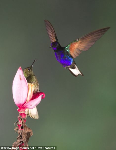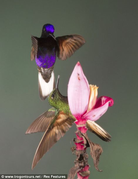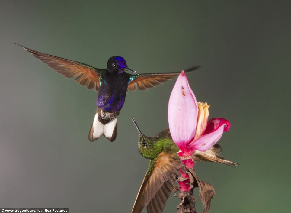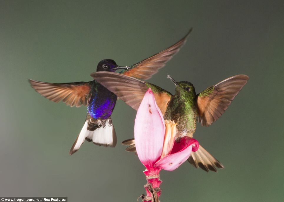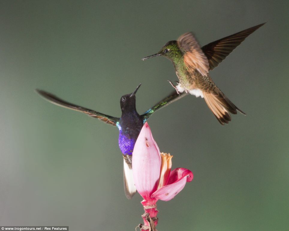 (08:56:40 AM 30/08/2012)“Tôi đặt bông hoa chuối lên một bàn kẹp và đổ nước đường - thức uống ưa thích của những con chim ruồi vào đó”, Nate giải thích. Chính điều đó đã thu hút 2 con chim ruồi tới. Cuộc chiến có vẻ khá căng thẳng vì bông hoa chuối chỉ đủ chỗ cho 1 con, mà con nào cũng muốn giành được món ngon này.