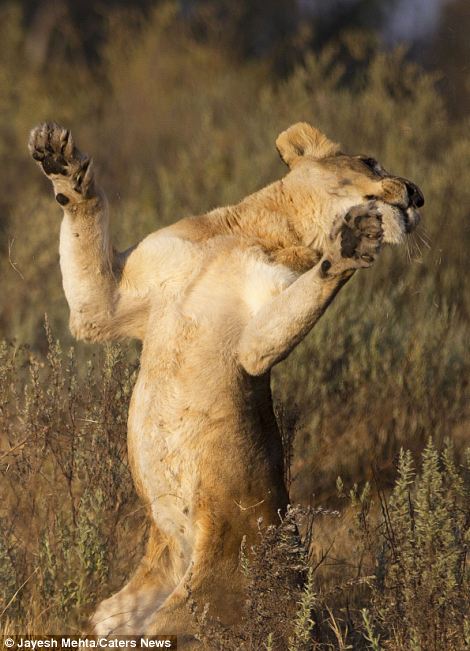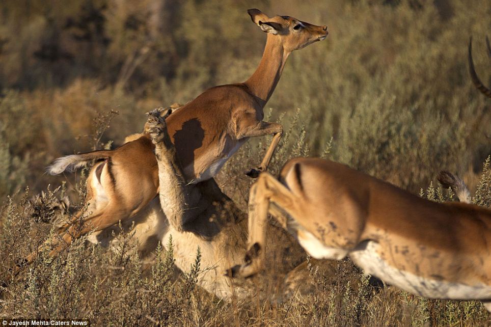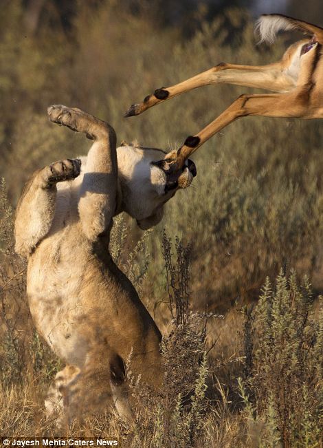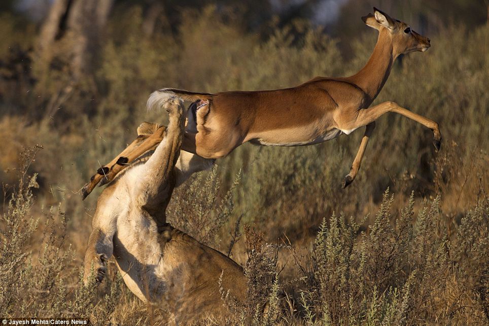 (08:10:33 AM 29/08/2012)Thậm chí, trong một bức ảnh, ta còn thấy bộ móng của linh dương như đang nằm gọn trong mồm con sư tử cái. Khoảnh khắc ngoạn mục này đã được nhiếp ảnh gia Jayesh Mehta ghi lại ở Botswana.