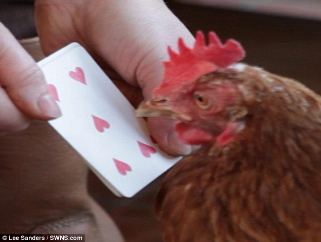 (09:42:52 AM 16/11/2012)Con gà JJ được dạy đếm từ 1-7 và đang cố gắng đến đến 8. Nó có thể phân biệt được số và chất trên quân bài tú lơ khơ. Mỗi lần nó làm đúng nó rất thích được thưởng bằng hạt hướng dương.