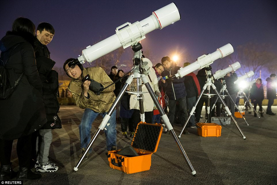 Những người đam mê thiên văn học ở Bắc Kinh tề tựu quan sát và chụp ảnh hiện tượng siêu trăng đêm 31/1. Ảnh: Reuters.