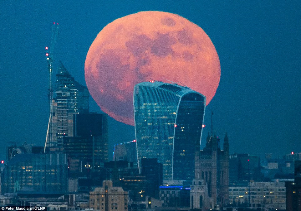 Đêm nguyệt thực 31/1 tại London ở Anh. Mặt Trăng thường quay quanh Trái Đất trong 29,5 ngày. Tháng 1/2018 có 31 ngày, trong đó ngày rằm tháng 11 âm lịch rơi vào ngày 1/1, ngày rằm của tháng Chạp rơi vào ngày 31/1. Vì vậy, chúng ta có cơ hội được chứng kiến trăng tròn hai lần trong một tháng (trăng xanh). Ảnh: LNP.