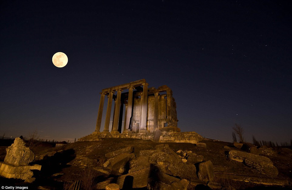 Trăng mọc ở vùng thành cổ Aizanoi, quận Cavdarhisar của Kutahya, Thổ Nhĩ Kỳ, ngày 31/1. Ảnh: Getty.