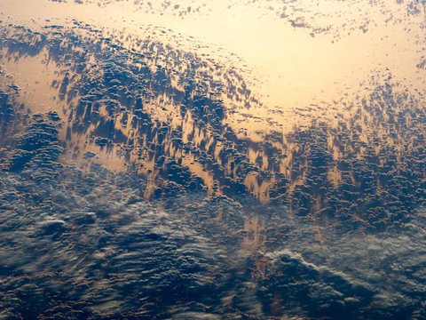 Bề mặt Thái Bình Dương chuyển sang màu vàng do hiện tượng phản chiếu ánh sáng mặt trời trong một bức ảnh được chụp từ Trạm Không gian Quốc tế. Ảnh: NASA.