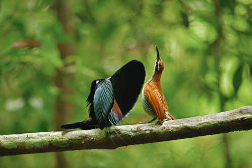 | Màn tán tỉnh ấn tượng của một con chim đực (trái) với con cái. Chim thiên đường sống trong các khu rừng nhiệt đới, bao gồm rừng mưa nhiệt đới, rừng đầm lầy và rừng rêu. |
