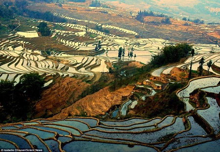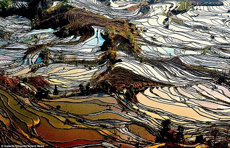 Những họa tiết xuất thần này kỳ thực được tạo nên từ ánh sáng mặt trời phản chiếu xuống những thửa ruộng bậc thang ngập nước.