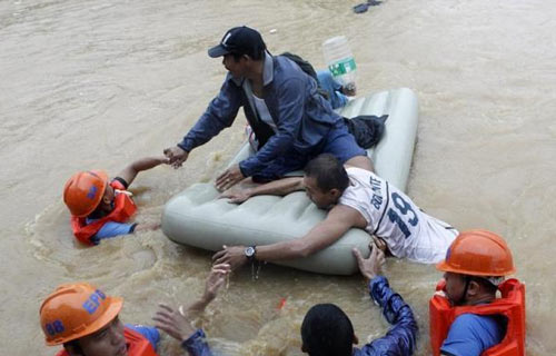 | Người dân di chuyển tới vùng cao hơn trên phao của lực lượng cứu hộ tại Marikana (Philippines) hôm 7/8. |
