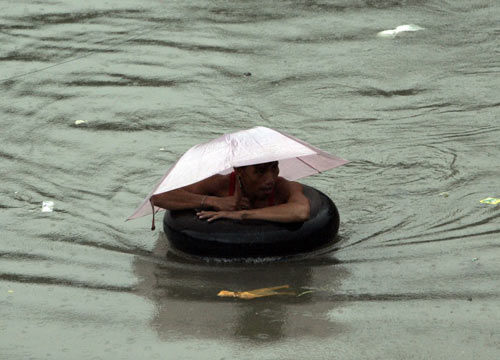 | Người đàn ông này dùng phao để di chuyển tại thành phố Quezon, phía Bắc Manila (Philippines). |