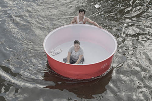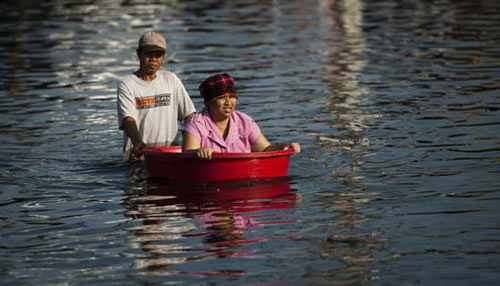 | Vợ được ưu tiên ngồi trong chiếc chậu lớn để chồng đẩy đi, khi nước ngập ở Bangkok hồi tháng 10 năm ngoái. |