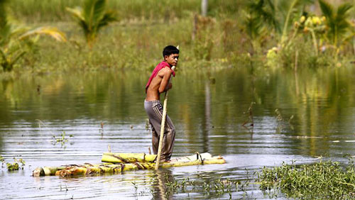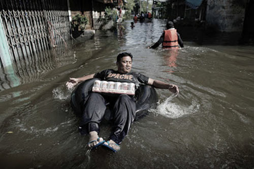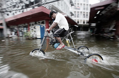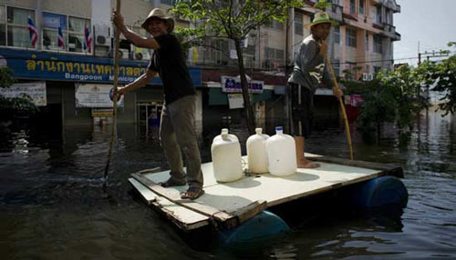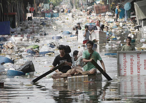 | Người dân vượt qua rác rưởi bằng thuyền tự chế ở Bangkok, Thái Lan trong trận lụt lịch sử năm 2011. |
