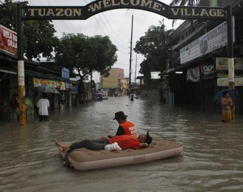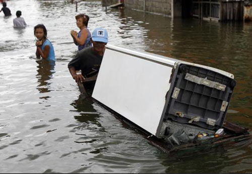 | Người dân ở Malabon (Philippines) chở tủ lạnh trên đường phố mênh mông nước. |