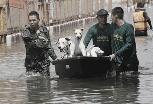 | Các binh sĩ ở Bangkok giúp các chú khuyển đến nơi an toàn. |