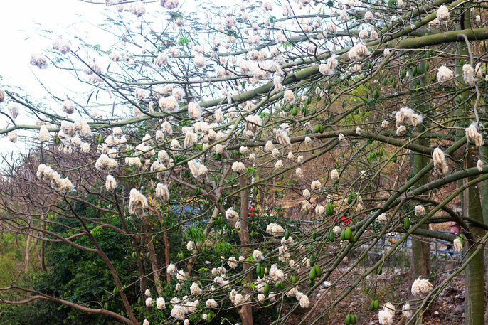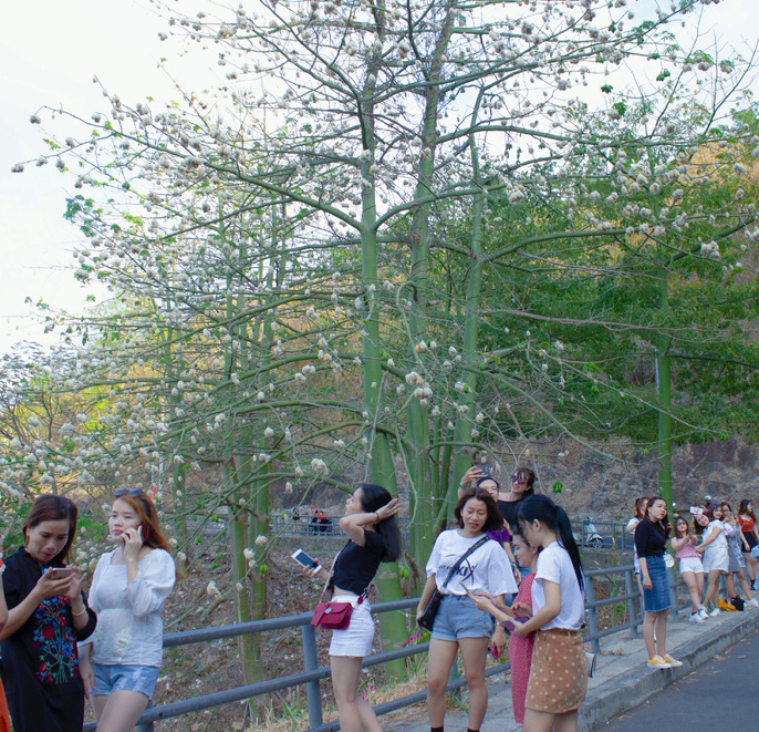 Giữa tiết trời nóng bức, những hàng cây trên núi khô cằn vì thiếu nước thì một vài cây bông gòn không còn lá, quả nở bung những sợi bông trắng sữa đã lấy lại vẻ đẹp, lãng mạn cho cả cung đường