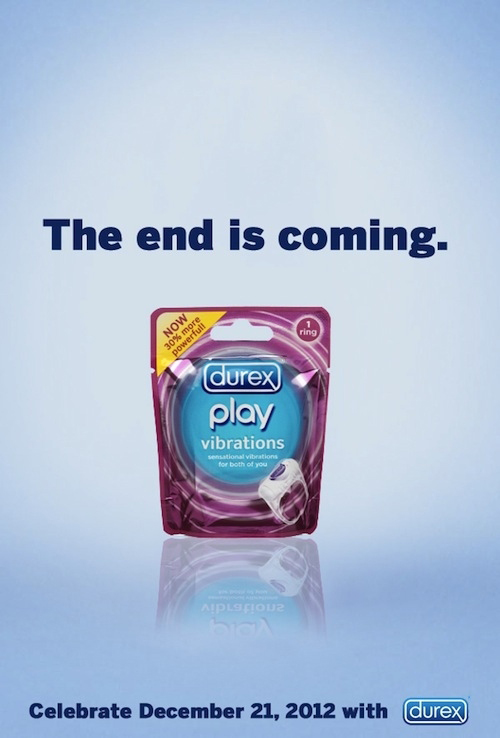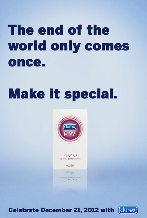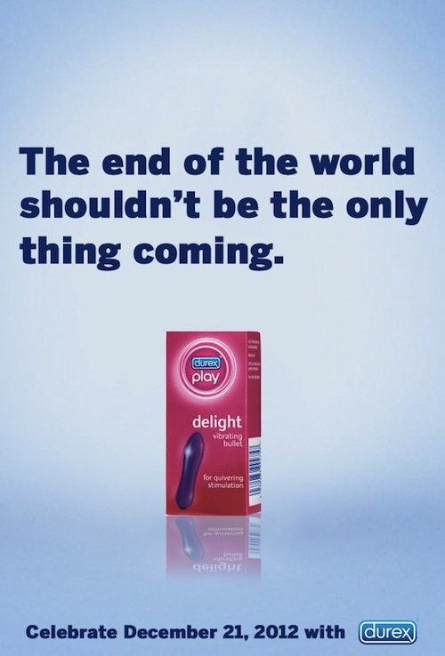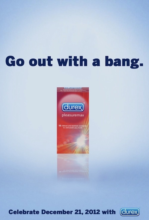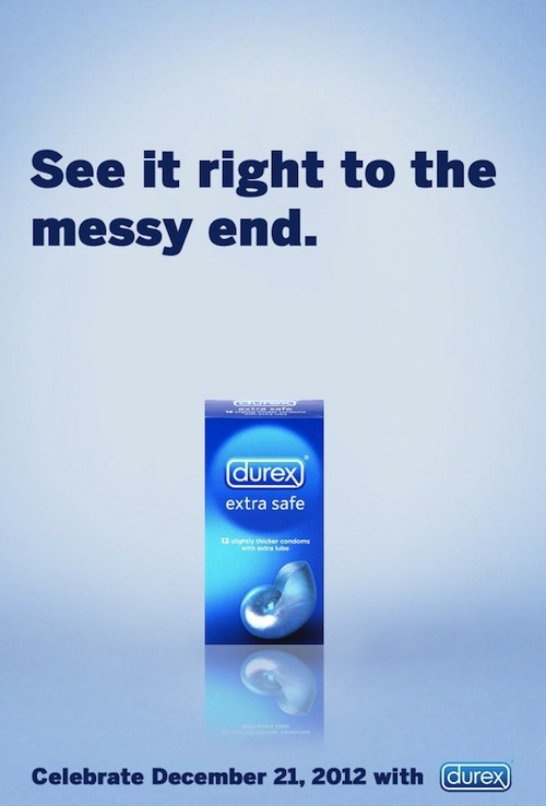 (Tin Môi Trường) - Durex - hãng sản xuất bao cao su của nước Pháp tranh thủ cơ hội của "ngày tận thế" (21/12/2012) để tung ra chiêu tiếp thị độc đáo với những câu quảng cáo hài hước.