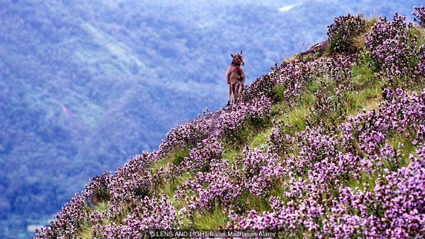 Tuy nhiên, con người khó có thể bỏ qua vẻ đẹp của Neelakurinji. Loài cây này trải thảm ở những triền đồi, trong khu vực được bảo hộ. 12 năm một lần, hoa lại khoe sắc. Ảnh: Alamy.