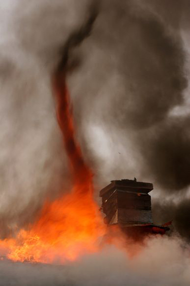Vòi rồng: Một vòi rồng lửa di chuyển gần ống khói của một tòa nhà cháy tại Mỹ trong năm 2010. Ảnh: National Geographic.