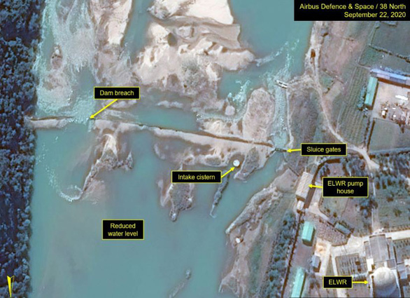 (20:04:29 PM 26/09/2020)Ảnh vệ tinh ngày 22-9 cho thấy phần đập bị vỡ (Dam breach, bên trái) gần khu phức hợp hạt nhân Yongbyon - Ảnh chụp màn hình 38 North/CNES