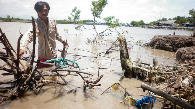 “Từ huyện Năm Căn về đây cất nhà ở cách bờ biển tới 20m. Nhưng chỉ ở được khoảng năm tháng thì đất lở tới trước mặt nhà. Nhiều lúc biển động, sóng dập vào bờ nước văng cao tới nóc nhà. Chịu không nổi nên anh Đậm dọn nhà bỏ xứ đi luôn. Còn tôi, chắc cũng nay mai...” - chỉ tay về vàm Mỹ Bình, ông Tuyết bỏ lửng câu nói.