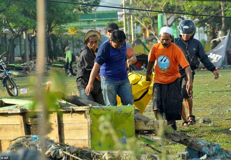 Thu thập thi thể nạn nhân ở Palu. Ảnh: AP