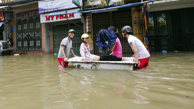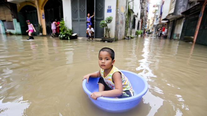 Đường biến thành sông giữa Hà Nội là khung cảnh “kỳ thú” đối với hai chị em Khánh Linh, Khánh Minh (tầng 20 tòa nhà Keangnam). Khánh Linh cho biết: “Đáng ra sáng nay cháu phải đi học nhưng ôtô của bố cháu chết máy giữa đường nên cháu được nghỉ”. Chỉ xuống dòng nước, cô chị Khánh Linh ví von: “Nước bùn giống hệt lần trước cháu đi tắm biển Đồ Sơn”.