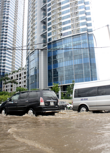 Nhiều xe tải nhỏ chỉ đi khoảng 50m đã chết máy phải gọi người đến đẩy. Xe máy cố tìm chỗ ít ngập để đi cũng bị sóng do ôtô đi qua xô ngã dúi dụi. Sợ tình trạng xe máy tránh ngập leo lên vỉa hè, ban quản lý tòa nhà Keangnam đã sớm cho bảo vệ túc trực, giăng dây để ngăn chặn. Những người đi xe máy muốn qua đoạn ngập chỉ có cách lao ra giữa dòng nước và không mấy chiếc xe thoát khỏi cảnh chết máy. Cũng chỉ chờ có thế, hàng loạt điểm sửa xe tự phát mọc lên như nấm. Thay bugi mất ít nhất 50.000 đồng/chiếc, đó là chưa kể các kiểu kiểm tra, sửa chữa khác. Thiệt hại nhẹ nhất của một lần xe chết máy cũng 100.000 đồng.