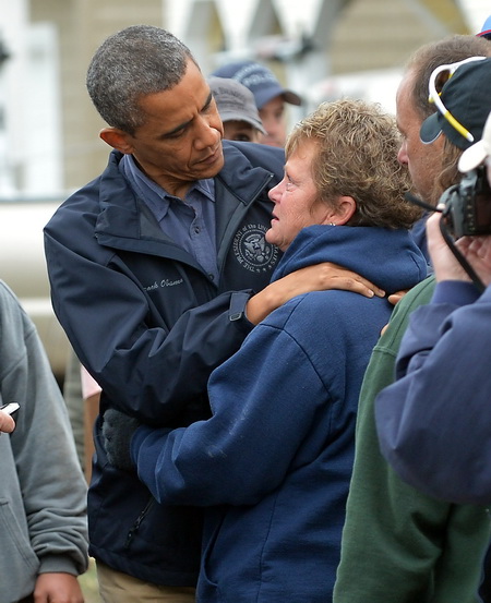 “Tôi luôn nghĩ đến các bạn và cầu nguyện cho các bạn. Chúng tôi sẽ ở lại đây trong một thời gian dài”, ông Obama nói với người dân đang phải sống trong những căn lều tránh bão, đồng thời lắng nghe người dân kể về những mất mát mà họ phải gánh chịu.