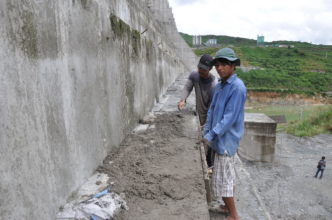 | Công nhân trét, trám phía dưới chân đập thủy điện sáng 5-9 - Ảnh: Tấn Vũ |