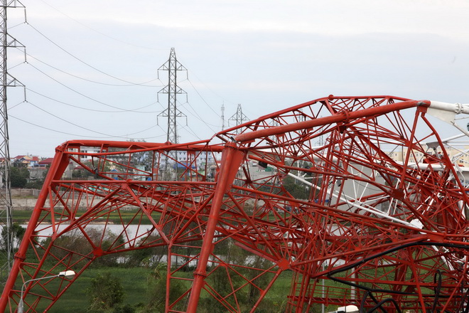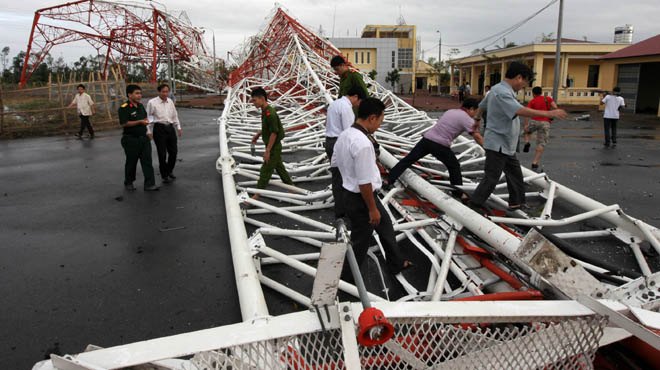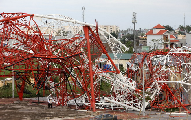Cột tháp truyền hình Nam Định cao 180m trở thành đống sắt rúm ró sau cơn gió giật cấp 12 của bão Sơn Tinh. Trong khi đó, nhiều nhà chuyên môn đặt vấn đề: tiêu chuẩn quốc gia là phải chịu được gió cấp 15 - Ảnh: Việt Dũng