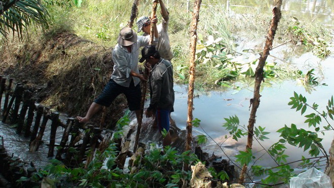 | Đóng cừ tràm để đắp lại đoạn bờ bao bị vỡ |