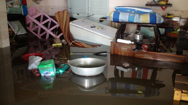 Trong nhà bà Nguyễn Thị Hiệp, nước vẫn ngập tới đầu gối, đồ đạc ngâm nước hàng giờ liền. Bà Hiệp cho biết lúc gia đình bà đang ngủ thì nước chảy ào ào vào nhà. Chỉ mấy phút nước đã ngập mấp mé cửa sổ. Cả nhà không kịp đưa đồ đạc ra ngoài nên đành chờ đến sáng.