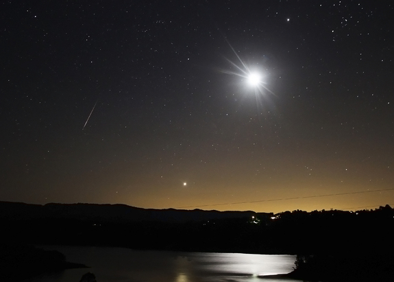 | Sao băng hòa lẫn với trăng và sao trên bầu trời tại Las Vegas, Nevada, Mỹ. |