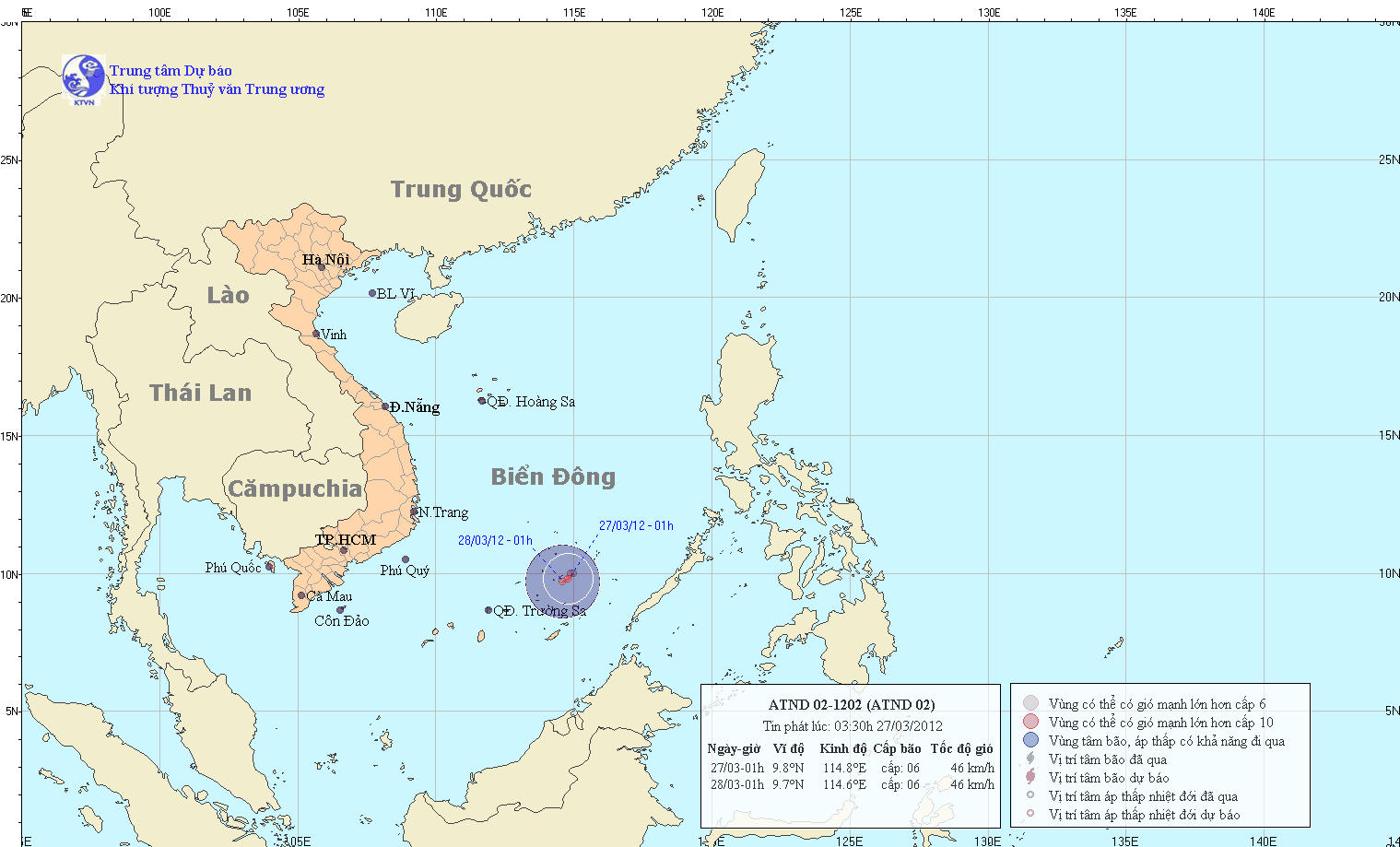 (09:12:42 AM 27/03/2012)Hồi 1 giờ ngày 27/3, vị trí tâm áp thấp nhiệt đới (ATNĐ) ở vào khoảng 9,3-10,3 độ Vĩ Bắc; 114,3-115,3 độ Kinh Đông, cách đảo Song Tử Tây thuộc quần đảo Trường Sa (Việt Nam) khoảng 180km về phía nam. Sức gió mạnh nhất vùng gần tâm ATNĐ mạnh cấp 6 (tức là từ 39-49km/giờ), giật cấp 7-8.