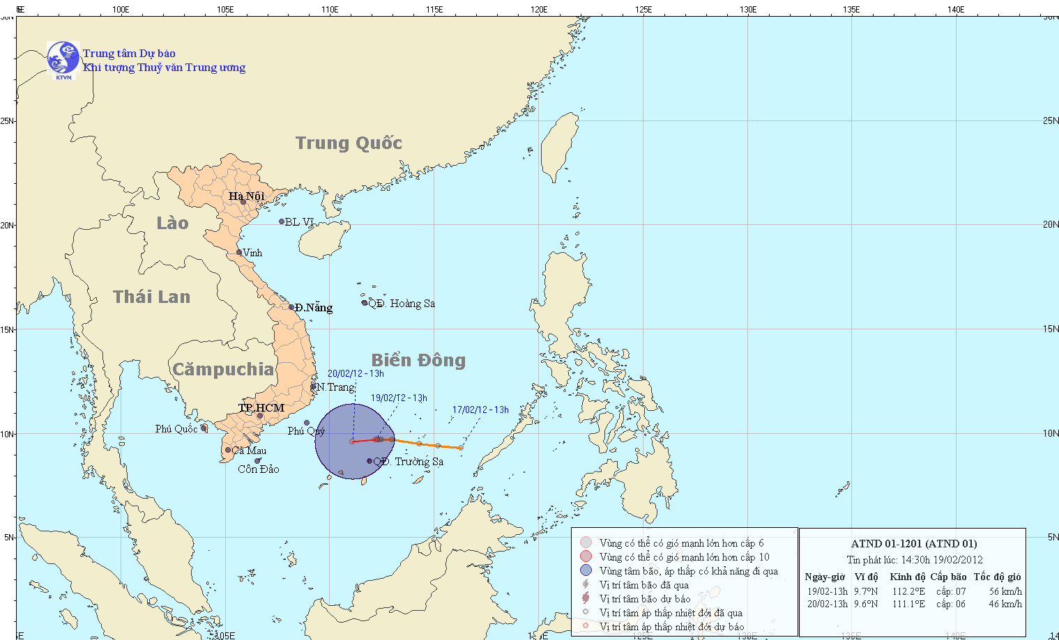 Dự báo trong 24 giờ tới, ATNĐ di chuyển chậm chủ yếu theo hướng tây, mỗi giờ đi được khoảng 5km. Đến 13 giờ ngày 20/2, vị trí tâm ATNĐ ở vào khoảng 9,6 độ Vĩ Bắc; 111,1 Kinh Đông, cách quần đảo Trường Sa khoảng 130km về phía tây bắc. Sức gió mạnh nhất vùng gần tâm ATNĐ mạnh cấp 6 (từ 39-49 km/ giờ), giật cấp 7-8.