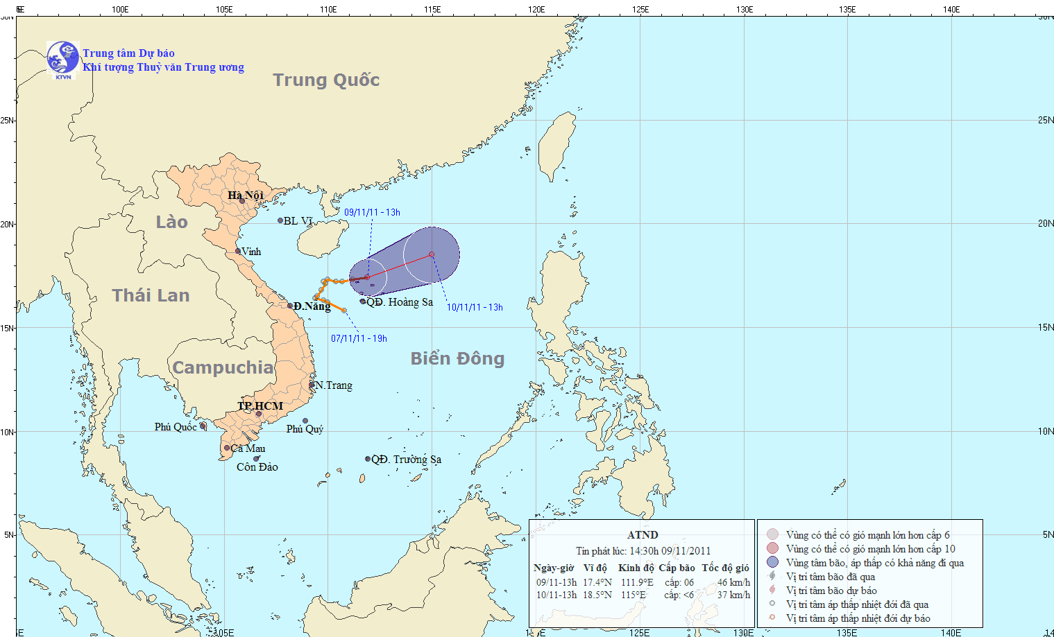 Lúc 13 giờ 9/11, vị trí tâm áp thấp nhiệt đới (ATNĐ) ở vào khoảng 17,4 độ Vĩ Bắc, 111,9 độ Kinh Đông; trên vùng biển phía bắc quần đảo Hoàng Sa (Việt Nam). Sức gió mạnh nhất vùng gần tâm ATNĐ đã suy giảm, chỉ còn mạnh cấp 6 (tức là từ 39-49km/giờ), giật cấp 7-8.