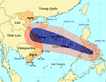 Vào lúc 13h ngày 25/10, vị trí tâm bão ở vào khoảng 13,7 độ vĩ Bắc; 119,6 độ kinh Đông, cách quần đảo Hoàng Sa khoảng 880 km về phía đông – đông nam. Sức gió mạnh nhất ở vùng gần tâm bão mạnh cấp 9 (tức là từ 75 đến 88 km một giờ), giật cấp 10, cấp 11.
