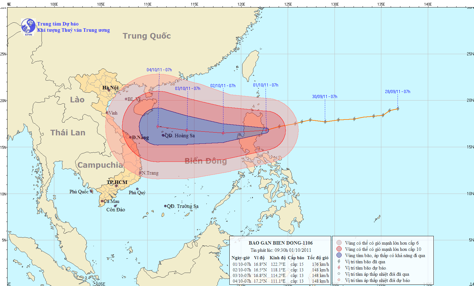 Dự báo trong 24 giờ tới, bão di chuyển theo hướng giữa tây và tây tây nam, mỗi giờ đi được khoảng 25km. Như vậy, khoảng chiều tối ngày 1/10, bão sẽ đi vào vùng biển phía đông khu vực bắc biển Đông. Đến 7 giờ ngày 2/10, vị trí tâm bão ở vào khoảng 16,5 độ Vĩ Bắc; 118,1 độ Kinh Đông, cách quần đảo Hoàng Sa (Việt Nam) khoảng 640km về phía đông. Sức gió mạnh nhất ở vùng gần tâm bão giảm, chỉ ở cấp 13 (tức là từ 134-149km/giờ), giật cấp 14-15.