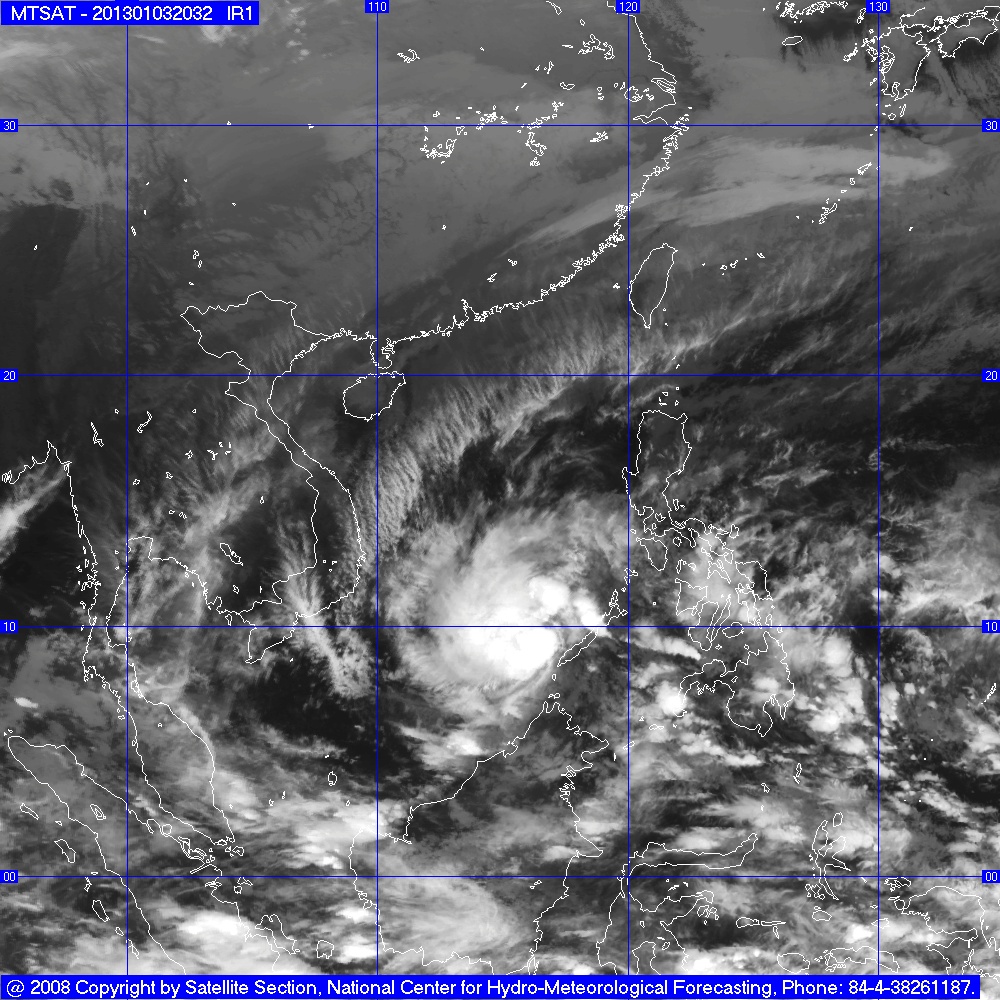 Hồi 4 giờ ngày 4/1, vị trí tâm bão ở  vào khoảng 8,5 độ Vĩ Bắc; 116,5 độ Kinh Đông, cách  đảo Trường Sa Lớn (thuộc quần  đảo Trường Sa) khoảng 510km về phía Đông. Sức gió  mạnh nhất ở vùng gần tâm bão   mạnh cấp 8 (tức là từ 62 đến 74km một giờ), giật cấp 9, cấp 10.