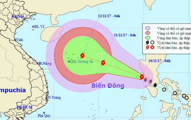 (10:18:16 AM 10/11/2017)Tâm bão số 13 (tên quốc tế Haikui - nghĩa là Hải quỳ) 7h sáng nay cách quần đảo Hoàng Sa khoảng 860 km về phía đông nam với sức gió đạt cấp 8 (60-75 km/h), giật cấp 10.