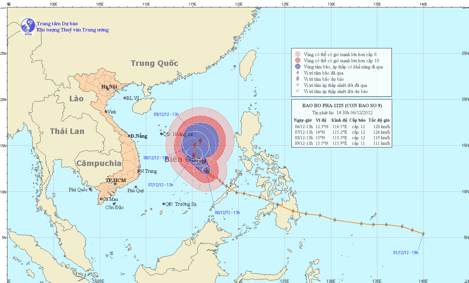Dự báo trong 24 giờ tới, bão di chuyển theo hướng Tây Bắc, mỗi giờ đi được khoảng 10 km. Đến 13 giờ ngày 07/12, vị trí tâm bão ở vào khoảng 14,0 độ Vĩ Bắc; 115,2 độ Kinh Đông, cách quần đảo Hoàng Sa khoảng 410km về phía Đông Nam. Sức gió mạnh nhất ở vùng gần tâm bão mạnh cấp 12 (tức là từ 118 đến 133 km một giờ), giật cấp 13, cấp 14.