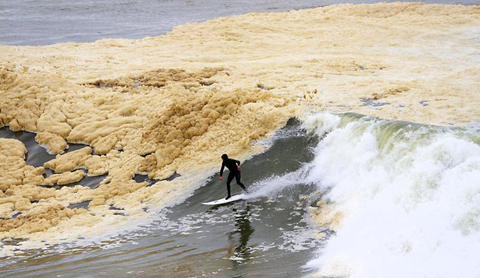 | Nhiều người vẫn bình thản lướt sóng khi có trận bọt biển. Ảnh: Solent News. |