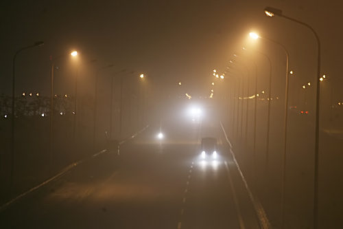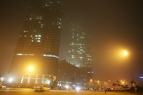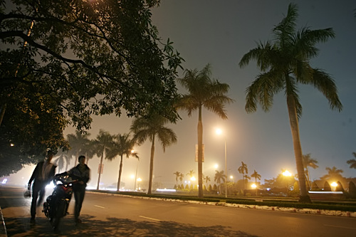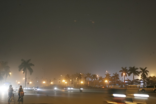 | Về đêm sương xuất hiện càng nhiều, hàng loạt đèn vàng (đèn phá sương) trên đại lộ Thăng Long cũng không thể phá vỡ nổi làn sương trắng. |