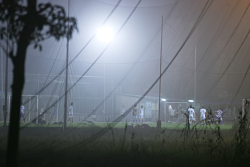 | Đội đá bóng phủi dưới cái lạnh mùa đông và trong làn sương trắng. |
