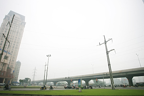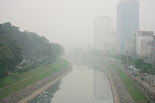 | Khu vực sông Tô Lịch chìm trong làn sương mờ ảo, khác hẳn vẻ xấu xí, hôi thối thường ngày của nó. |